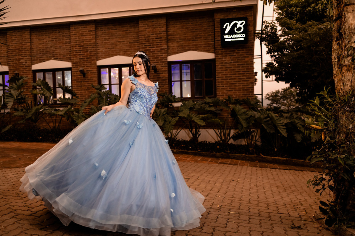 Ensaio externo da debutante Manu com vestido azul em frente à Villa Bosco, em Lajeado/RS — fotografia do Alba Estúdio.