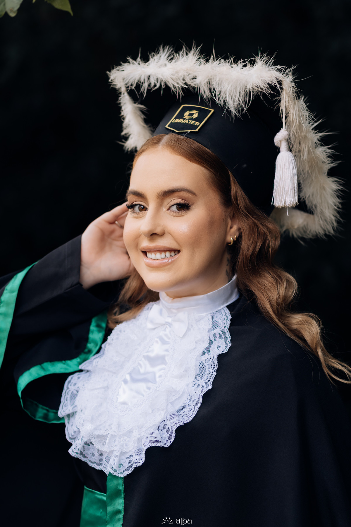 Formanda sorridente em ensaio de prova de toga da Univates, usando capelo com plumas brancas – Alba Estúdio, Lajeado.